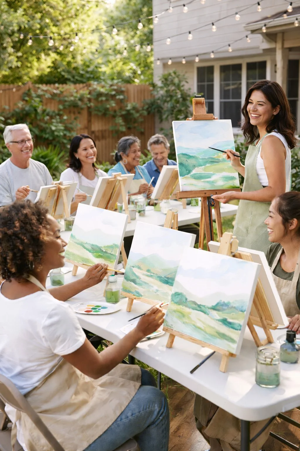 Each paint class includes all necessary painting supplies, canvases, brushes, aprons, and guided step-by-step instruction. We also take care of setup and cleanup, allowing hosts and guests to relax and fully enjoy the creative experience.